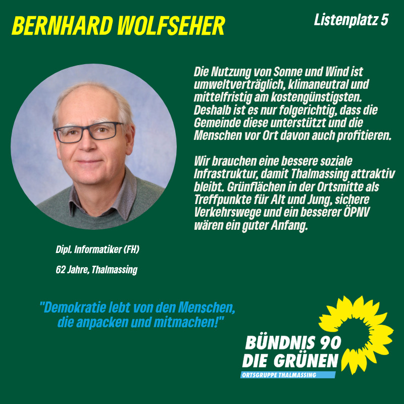 Auf Listenplatz 5 kandidiert Bernhard Wolfseher aus Thalmassing. Bernhard lebt hier bereits seit 25 Jahren und fühlt sich in Thalmassing auch heimisch. Als Diplom-Informatiker hat er ein Faible für Wissenschaft und Technik, weswegen er Gründungsmitglied und nun auch zur Leitung unseres Reparatur-Café’s gehört. Wenn Besitzer ihre defekten Gegenstände repariert bekommen und diese damit nicht im Müll landen, dann freut es auch ihn. Soziales und Nachhaltigkeit sind ihm wichtig. Deshalb ist er auch ein aktives Mitglied im Bund Naturschutz.
