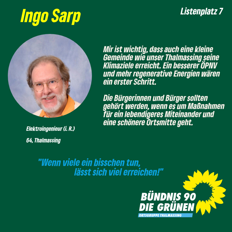 Unser nächster Kandidat ist Ingo Sarp. Der 64jährige Elektroingenieur (i.R.), der mit seinem Engagement im hiesigen Reparatur-Café seinen Teil dazu beiträgt, unnötigen Müll zu vermeiden, ist überzeugt davon, dass auch eine kleine Gemeinde wie Thalmassing einen wichtigen Beitrag zum Umwelt- und Klimaschutz leisten kann. Dazu möchte er innovative Ideen entwickeln und Bürgerinnen und Bürger miteinbeziehen. Die Kommune, die Bürgerinnen und Bürger sowie die Betriebe sollen davon profitieren können. Dazu gehört zum Beispiel ein sinnvolles Konzept für den ÖPNV.